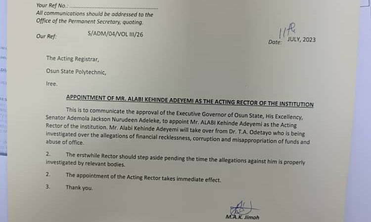 In another letter dated same day signed by the Permanent Secretary, the state government appointed Alabi Kehinde as acting rector with immediate effect.