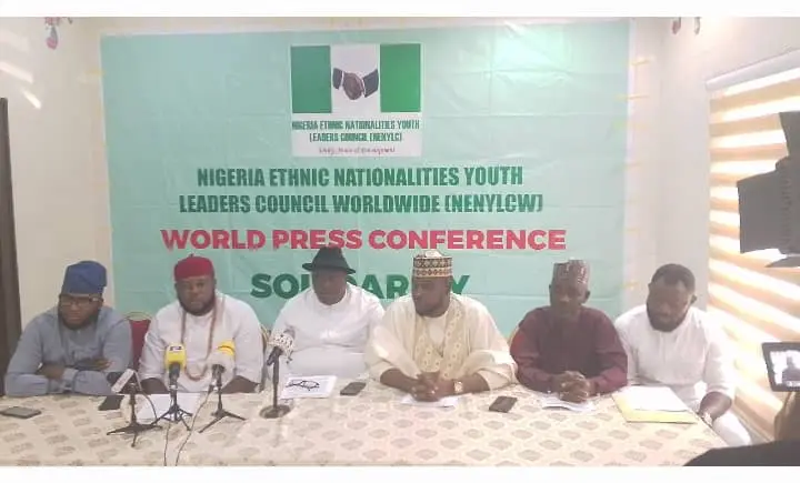 At the press conference were Comrade Terry Obeih, President General, Niger Delta Ethnic Nationalities Youth Leaders/NENYLCW, Alhaji Balarabe Rufai, President, Northern Youth Council/ Vice President, NENYLCW, Mazi Okwu Nnabuike, National President, Ohanaeze Ndigbo Youth Council Worldwide/ Publicity Secretary, NENYLCW, Comrade Emmanuel Zopmal, President, Middle-Belt Youth Council/ Organising Secretary, NENYLCW and Alhaji Hamisu Dass, President, North-East Youth Assembly/Treasurer, NENYLC.